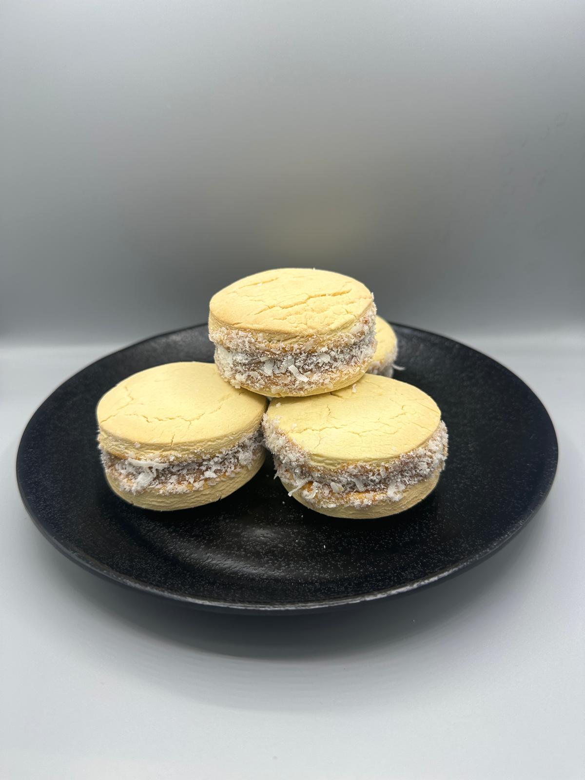 Soft shortbread or flour-based cookies filled with dulce de leche (caramel) and often coated in chocolate or powdered sugar.