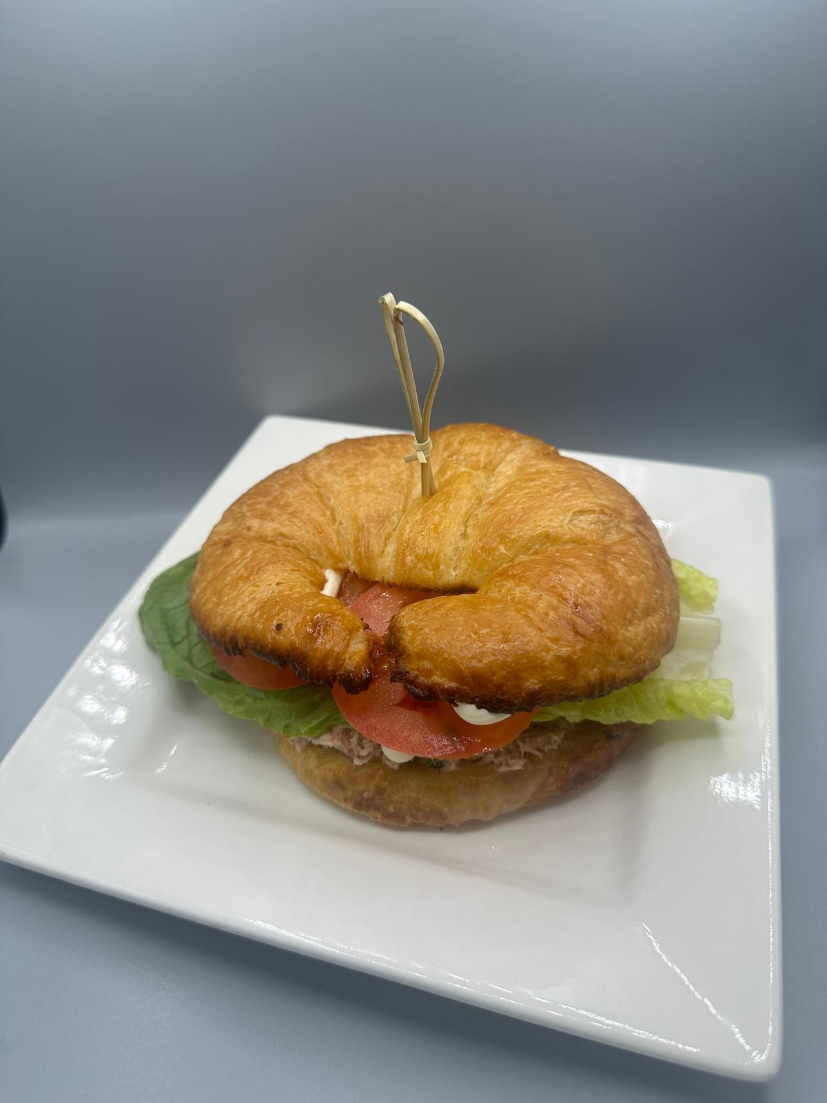 Croissant, chicken salad, swiss cheese, tomatoes, lettuce.